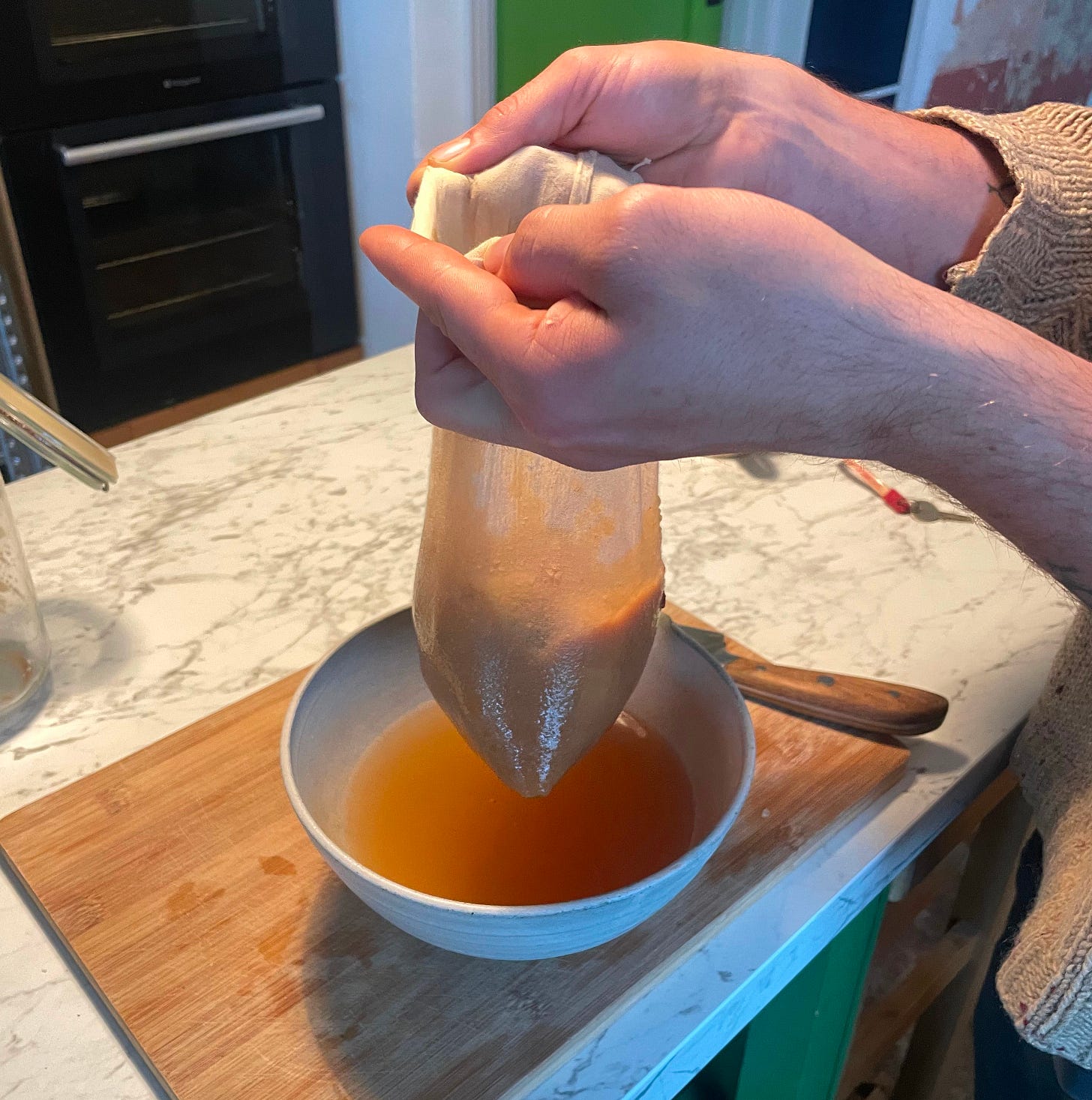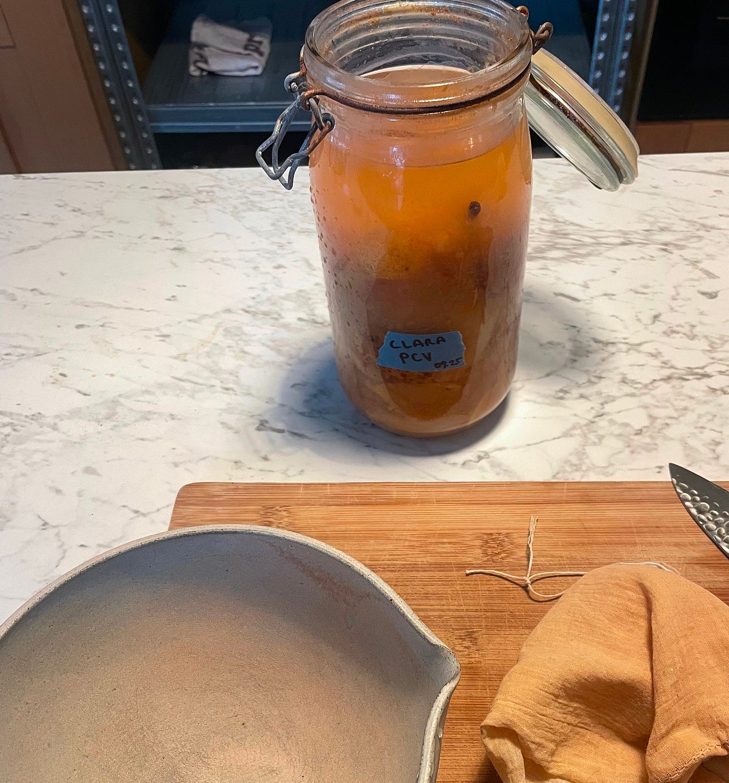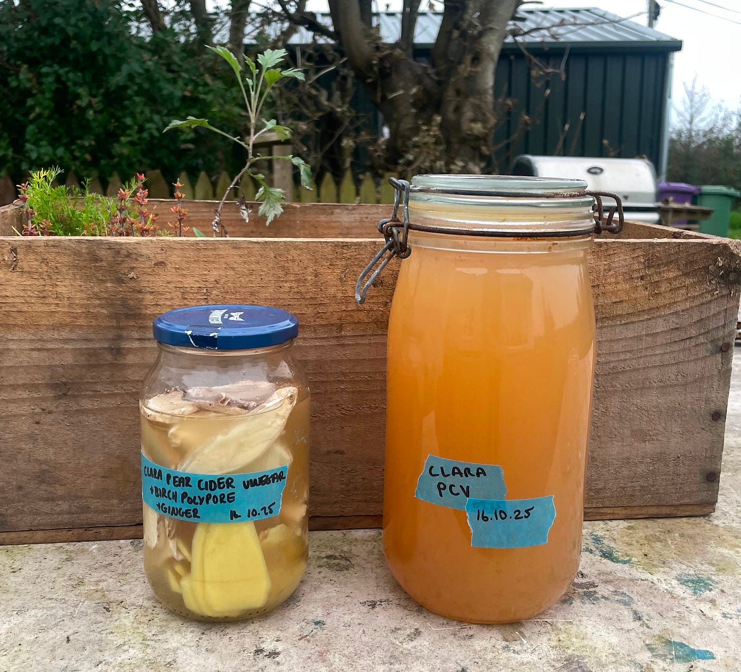 I had combined pears from the garden with water and sugar about 5 weeks ago and thought it time to strain and decant. I used a muslin bag and enjoyed the burning of my nostrils as the very satisfying result of my experiments. I made a small jar of medicine combining the vinegar with ginger and dried birch polypore. Let’s see how it goes!