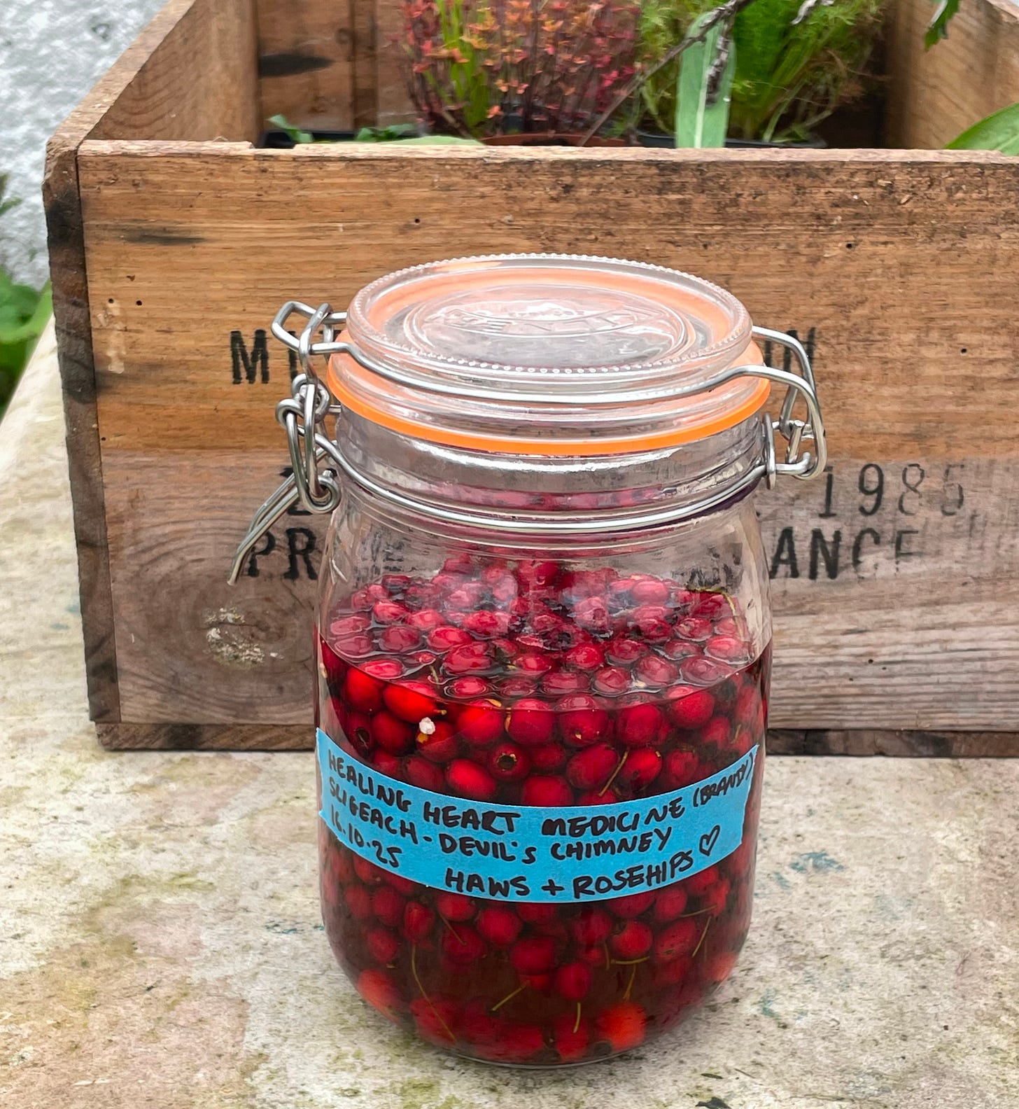 We gathered the berries from some old and lovely Hawthorn trees there and submerged them in brandy. That will sit for maybe 4-6 weeks before straining off into little dropper bottles. Winter heart tonic to share around!